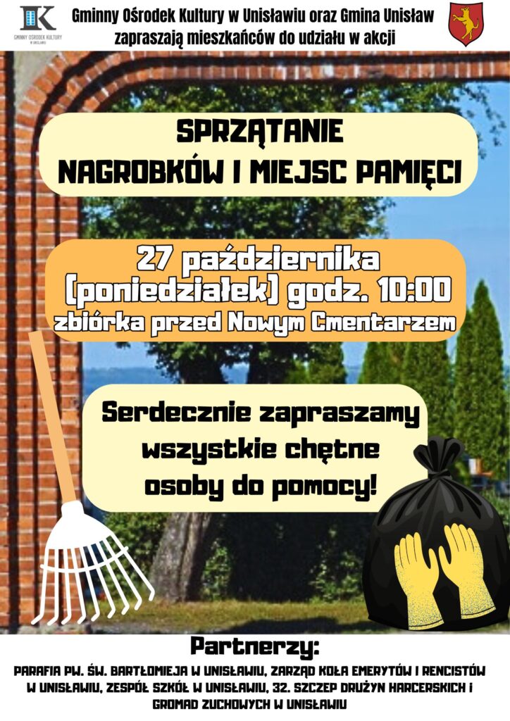 Zbliża się czas, w którym szczególnie wspominamy naszych bliskich i oddajemy hołd tym, którzy odeszli. W związku z tym Gminny Ośrodek Kultury w Unisławiu wraz z Gminą Unisław serdecznie zapraszają do udziału w akcji sprzątania nagrobków oraz miejsc pamięci, która odbędzie się w poniedziałek, 27 października. Akcja rozpocznie się o godz. 10.00 na cmentarzu parafialnym. Na miejscu dostępne będą m.in. worki na śmieci, rękawiczki oraz grabie.