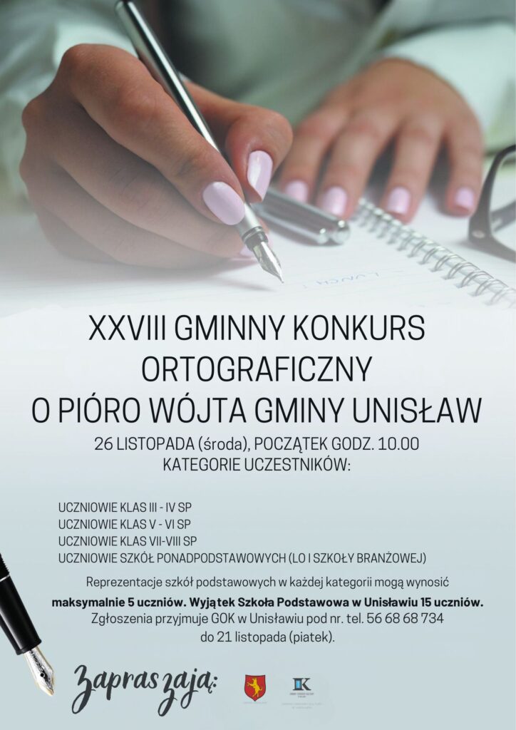 W środę, 26 listopada o godz. 10:00 w Gminnym Ośrodku Kultury w Unisławiu odbędzie się XXVIII Konkurs Ortograficzny o Pióro Wójta gminy Unisław.
