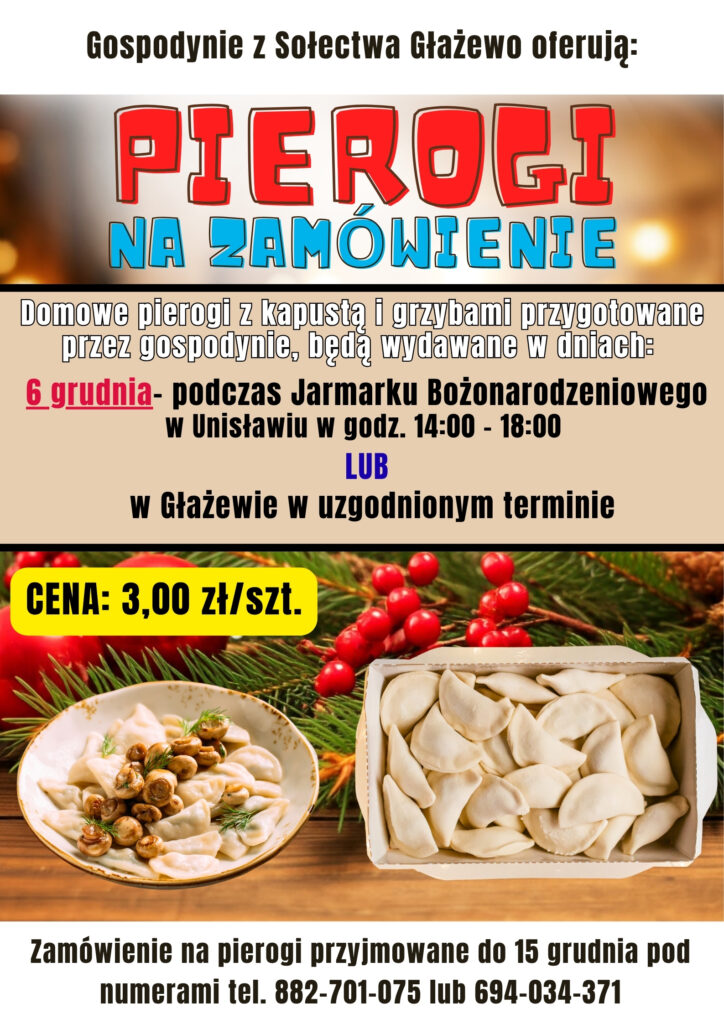 Gospodynie z Sołectwa Głażewo oferują domowe pierogi z kapustą i grzybami/pieczarkami na zamówienie. Pierogi będą wydawane 6 grudnia (sobota) na stoisku podczas Jarmarku Bożonarodzeniowego w Unisławiu w godz. 14:00-18:00 lub w Głażewie w uzgodnionym wcześniej terminie. Cena wynosi 3 zł/sztukę.