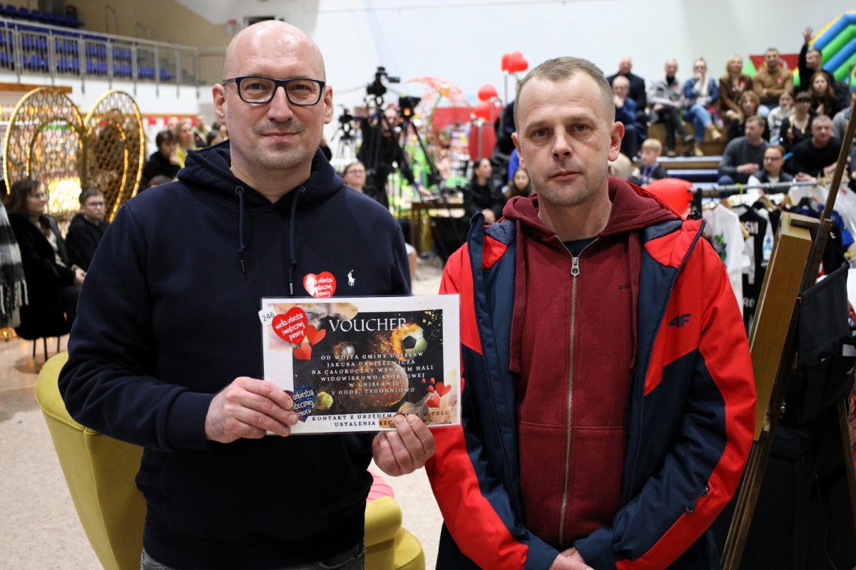 W centralnym punkcie znalazły się liczne licytacje. Cóż to było za zaangażowanie! Pod tak zwany „młotek” poszły przedmioty takie jak: mistrzowska bluza Emila Sayfutdinova (6050 zł), voucher na całoroczny wynajem hali (4000 zł), fotel elektryczny (2500 zł), konstytucja (2000 zł), apaszka i krawat premiera Donalda Tuska (1200 zł), koszulka Jakuba Piotrowskiego (1200 zł), voucher od Audi Centrum Toruń (2000 zł), skrzynia narzędzi od firmy Błażex (1600 zł), obraz Leny Śrubki (900 zł), lustro z drewna (850 zł), bukiet z Kwiaciarni Anastazja (500 zł), koszulka WOŚP (370 zł), zaproszenie na zawody żużlowe „Kryterium Asów” (400 zł), książka i plakat z podpisem Sławosza Uznańskiego (600 zł), sesja fotograficzna (500 zł), bluza Patryka Dudka (750 zł). Z całego serca dziękujemy wszystkim darczyńcom za kilkaset przeróżnych przedmiotów i voucherów, które otrzymał unisławski sztab. Dziękujemy, że możemy na was liczyć!