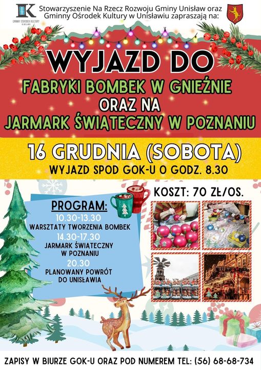 Gminny Ośrodek Kultury w Unisławiu wraz ze Stowarzyszenie na Rzecz Rozwoju Gminy Unisław serdecznie zapraszają na wyjazd do Fabryki Bombek w Gnieźnie oraz na Jarmark Świąteczny w Poznaniu , który odbędzie się 16 grudnia (sobota). Wyjazd spod GOK-u o godzinie 8.30. Koszt wyjazdu to 70 zł/os. (w cenie warsztaty tworzenia bombek oraz ubezpieczenie). Ilość miejsc ograniczona! Szczegóły znajdują się na plakacie.