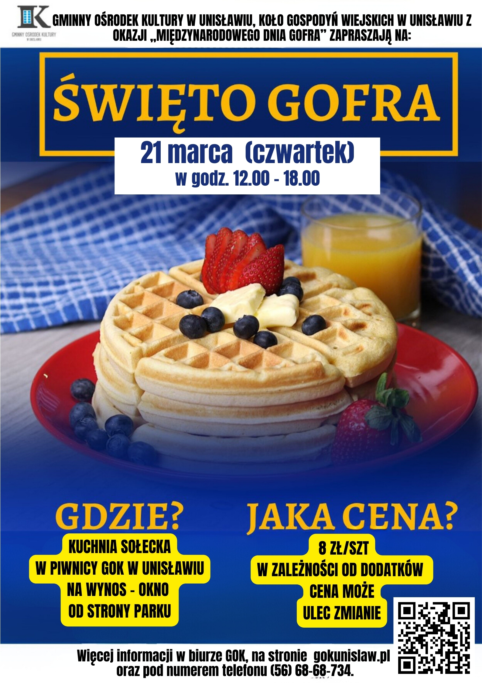 Z okazji „Międzynarodowego Dnia Gofra” wraz z Kołem Gospodyń Wiejskich w Unisławiu zapraszamy na Święto Gofra, które odbędzie się 21 marca (czwartek) w godz. 12.00 – 18.00. Tego dnia w kuchni sołeckiej w piwnicy GOK-u będzie można zakupić gofry na wynos. Cena wynosi 8 zł/szt (w zależności od dodatków cena może ulec zmianie). Zapraszamy serdecznie!