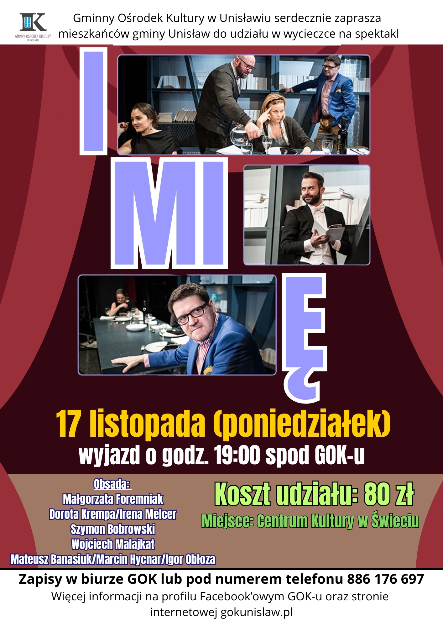 Gminny Ośrodek Kultury w Unisławiu serdecznie zaprasza mieszkańców gminy Unisław do udziału w wycieczce na spektakl komediowy „Imię”, który odbędzie się 17 listopada (poniedziałek) w sali widowiskowej – Centrum Kultury w Świeciu. Wyjazd spod GOK-u o godzinie 19:00, koszt udziału 80 zł za osobę (cena zawiera bilet wstępu, przejazd i ubezpieczenie). Czas trwania spektaklu ok. 1,5h.