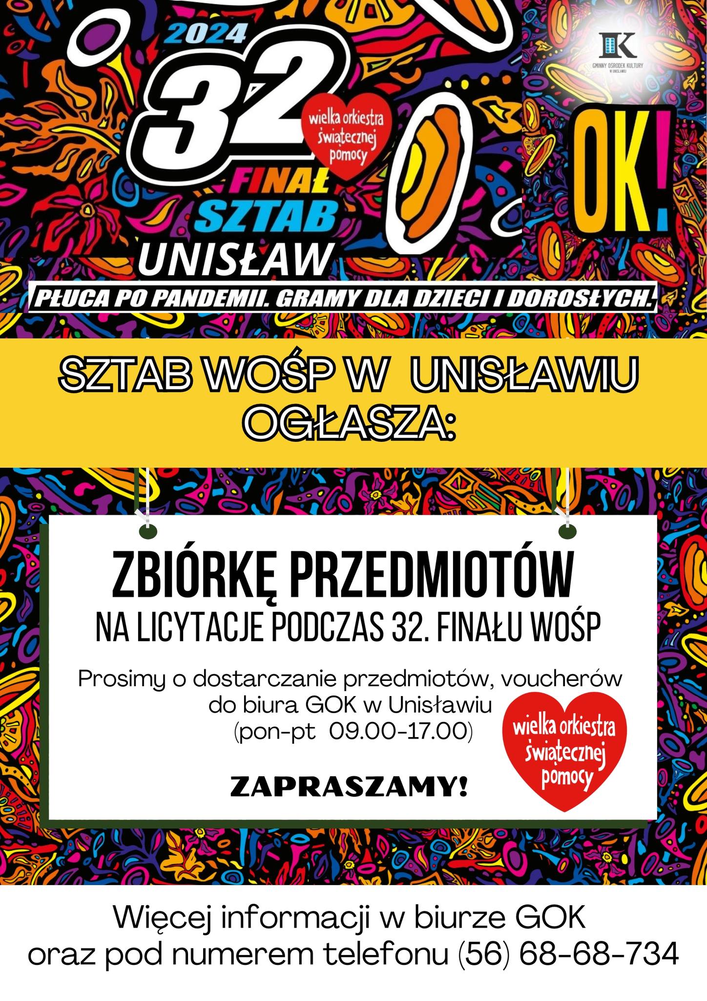 Gminny Sztab WOŚP w Unisławiu, wzorem lat ubiegłych, ogłosił zbiórkę przedmiotów na licytacje WOŚP 2024. Przedmioty i vouchery można dostarczać do biura GOK-u od poniedziałku do piątku w godz. 9.00 – 17.00. Orkiestrowa aktywność mieszkańców i wszystkich osób zainteresowanych jak zwykle mile widziana. Razem możemy więcej! Finał WOŚP, który zaplanowano na 28 stycznia 2024, odbędzie się pod hasłem „Płuca po pandemii. Gramy dla dzieci i dorosłych”.