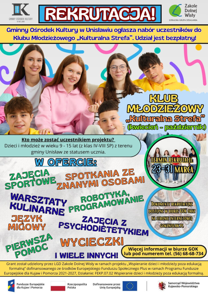 Klub Młodzieżowy „Kulturalna Strefa” to projekt, na realizację którego Gminny Ośrodek Kultury w Unisławiu otrzymał grant w kwocie 87 530,00 zł z budżetu Samorządu Województwa Kujawsko – Pomorskiego za pośrednictwem Lokalnej Grupy Działania „Zakole Dolnej Wisły”.