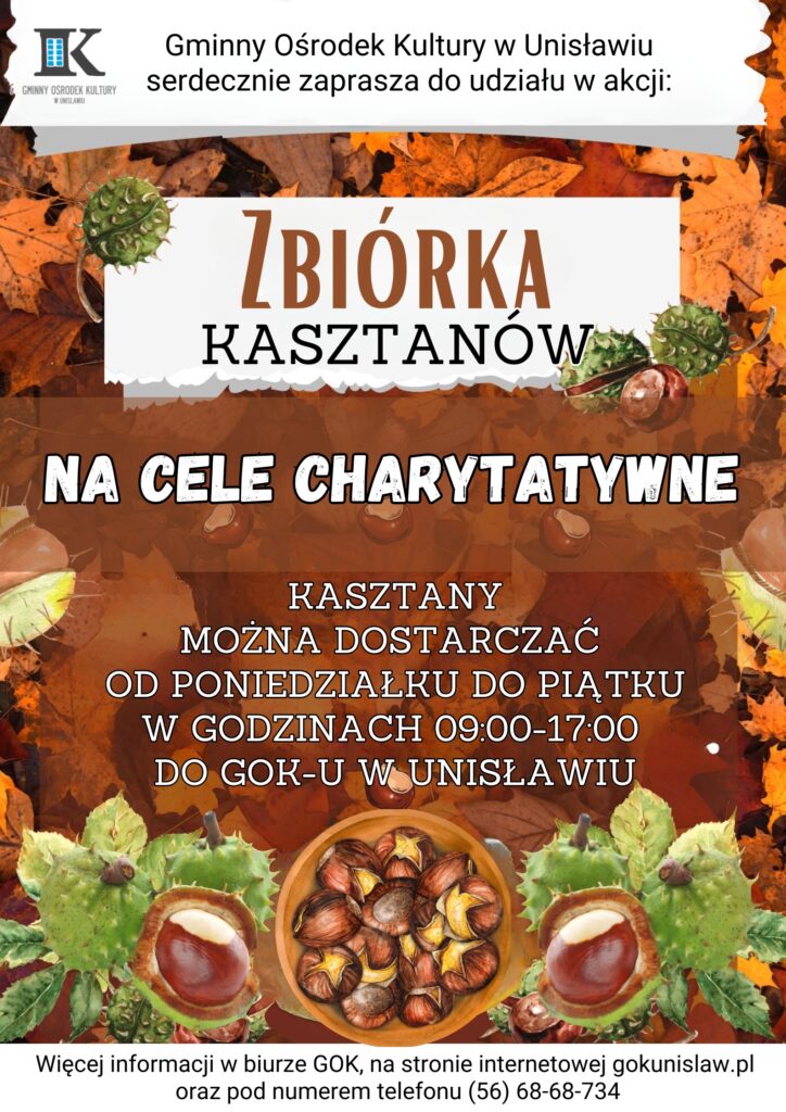 Gminny Ośrodek Kultury w Unisławiu serdecznie zaprasza do udziału w akcji zbiórki kasztanów, która ma na celu wsparcie tych, którzy potrzebują pomocy. Kasztany można dostarczać od poniedziałku do piątku w godzinach 9:00 – 17:00 do GOK-u. Wszystkie zebrane kasztany zostaną sprzedane, a dochód zostanie przeznaczony na cele charytatywne.